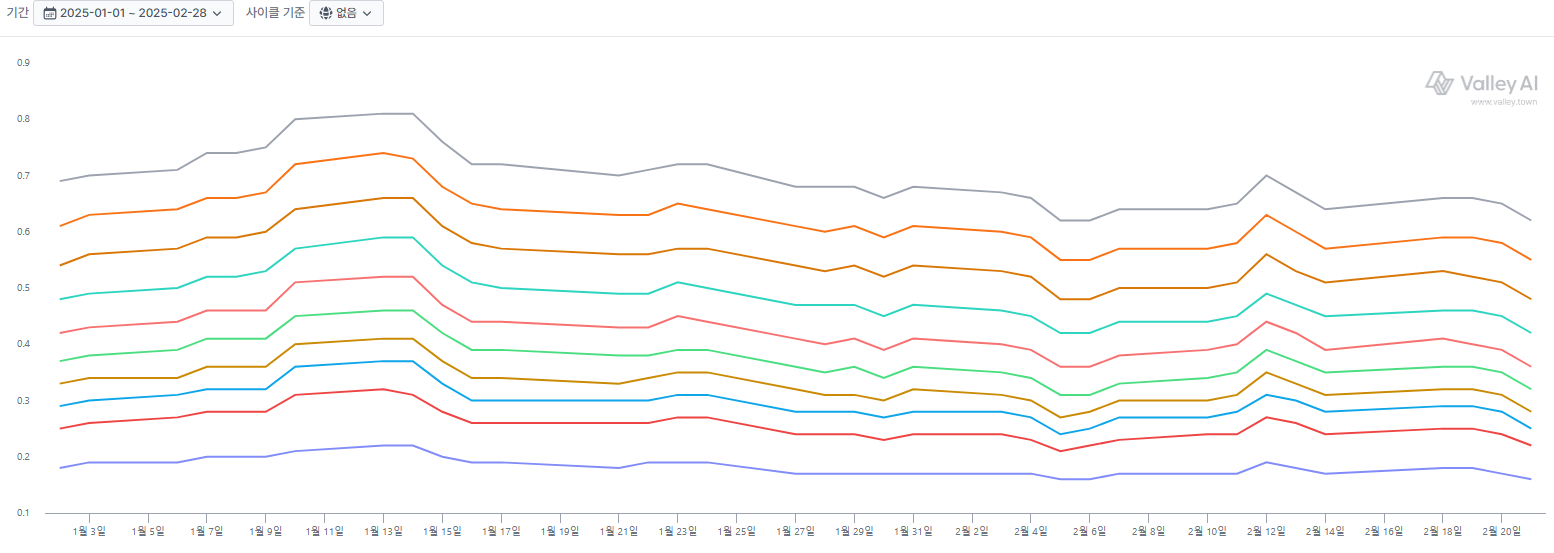 '25년 초 1년물~10년물 국채의 텀프리미엄 추이 ('25.1.1.~'25.2.21.)