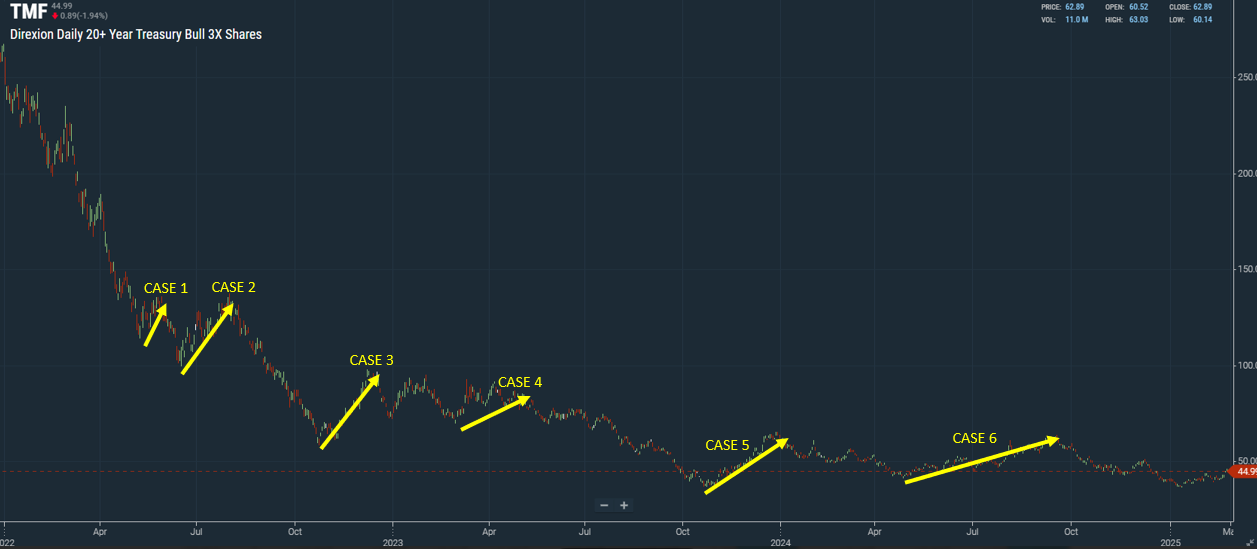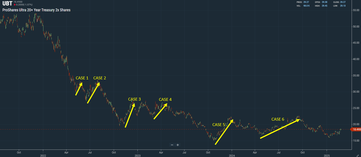 먼저 레버리지(UBT, TMF)를 제외하고 CASE 1~6을 경우의 수라고 가정해서 보겠습니다. 총 6회 경우의 수에서 TLT가 주식(S&P500, 나스닥, 엔비디아)보다 우수했던 경우는 2회입니다. 이것을 확률로 가정하고 정리해 보면 다음과 같습니다.
