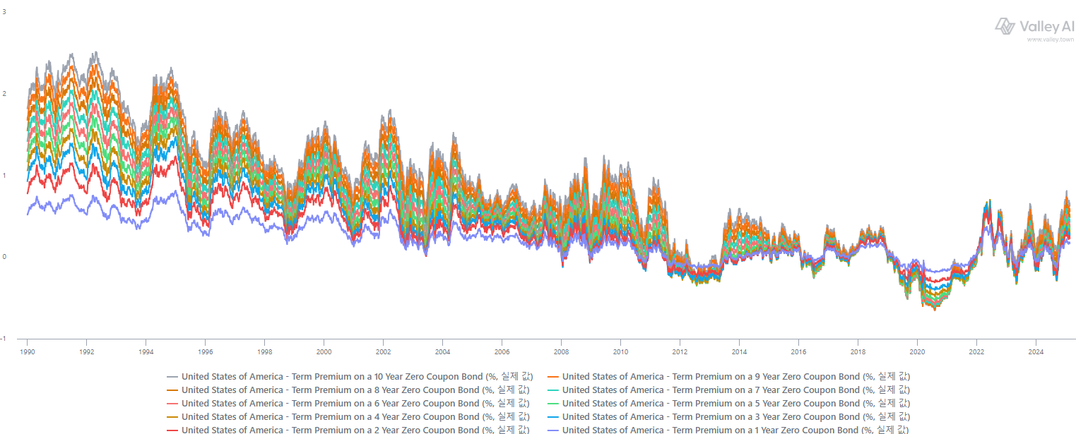 미국 국채의 텀프리미엄 추이 (1990년 이후~2025년 2월)