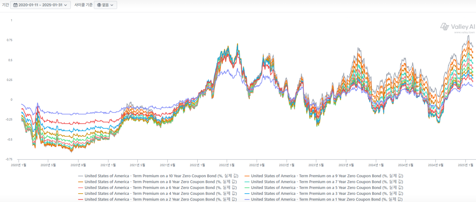 위 FRED의 그래프보다는 좀 더 깊이 들여다보고자 Valley AI의 그래프를 일부 인용하였습니다. 텀프리미엄은 국채의 만기가 길어질수록 더 변동성이 심해지는 특성이 있습니다. 그래서 아래의 1년물~10년물 그래프에서 보면 그 차이가 도드라짐을 볼 수 있습니다. 텀프리미엄이 늘어날 때는 1년물~10년물 격차가 벌어지다가, 텀프리미엄이 낮아질 때는 격차도 줄어듭니다.