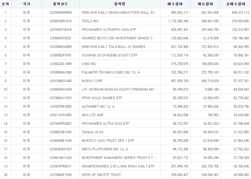 역사적인 하락장에서 많은 이들이 큰 손실을 입었지만, 특히 기술주 레버리지에 집중한 투자자들은 막대한 손실을 입고 말았습니다. 한국예탁결제원이 운영하는 증권정보포털(SEIBro)에서 국제거래 - 외화증권예탁결제 - 종목별내역(TOP50)에서 순매수 상위 미국 주식 종목을 보실 수 있는데, 최근 2주간(25.3.19.~25.4.4.) 순매수 상위 종목에 SOXL(미국 반도체 3배 레버리지), TQQQ(나스닥 3배 레버리지), TSLL(테슬라 2배 레버리지), NVDL(엔비디아 2배 레버리지) 등 기술주 레버리지 종목이 올라 있음을 알 수 있습니다.