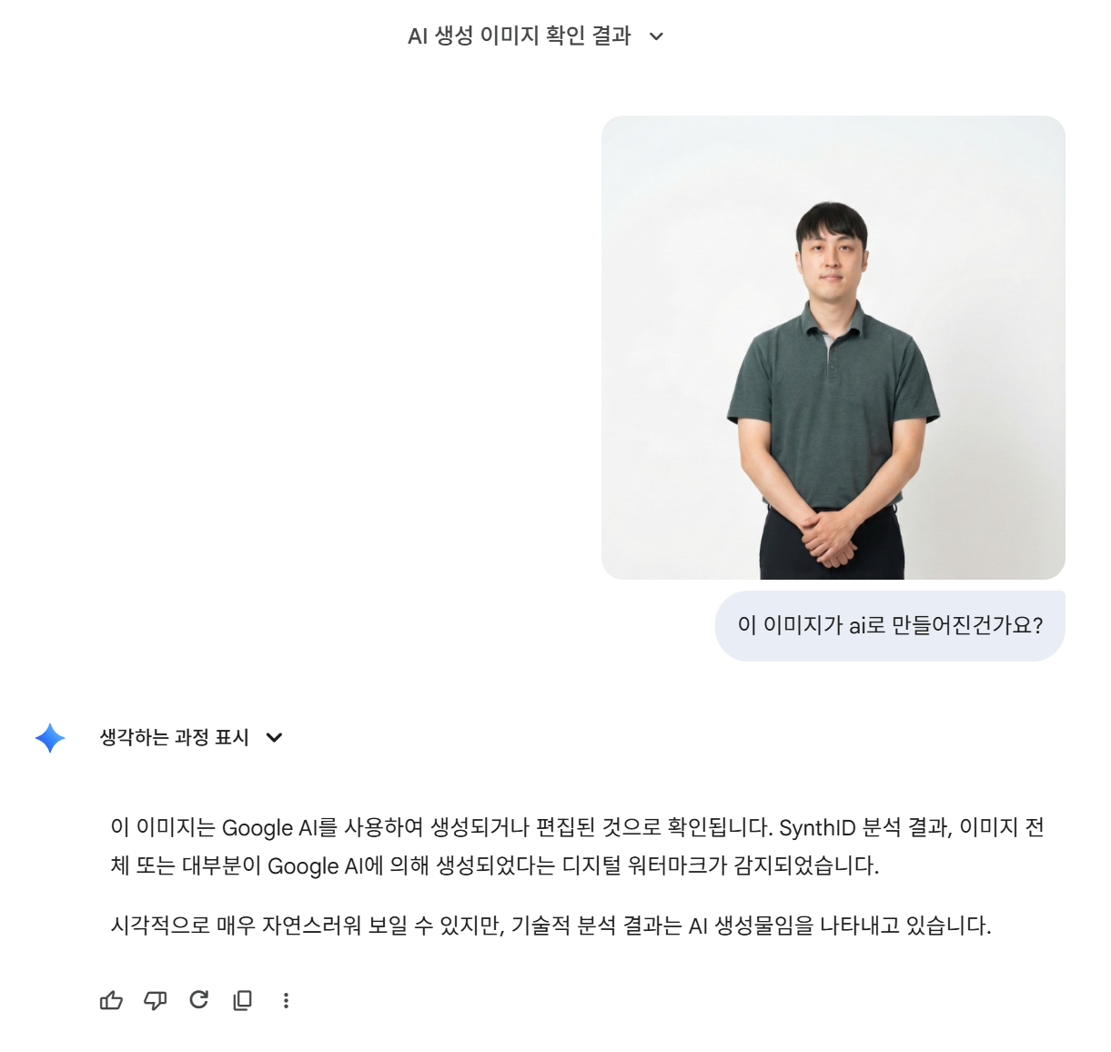 그래도 다행인 것은 제미나이로 만들어진 이미지는 어플에 업로드해서 AI인지 검증해볼 수 있습니다.