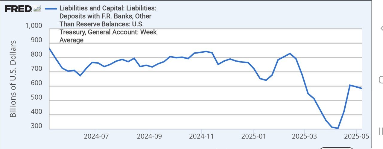 TGA 잔고는 점점 떨어지는 추세(돈이 미묘하게 풀리고 있음) & Gloal M2는 점진적으로 상향중(긍정적인 부분)