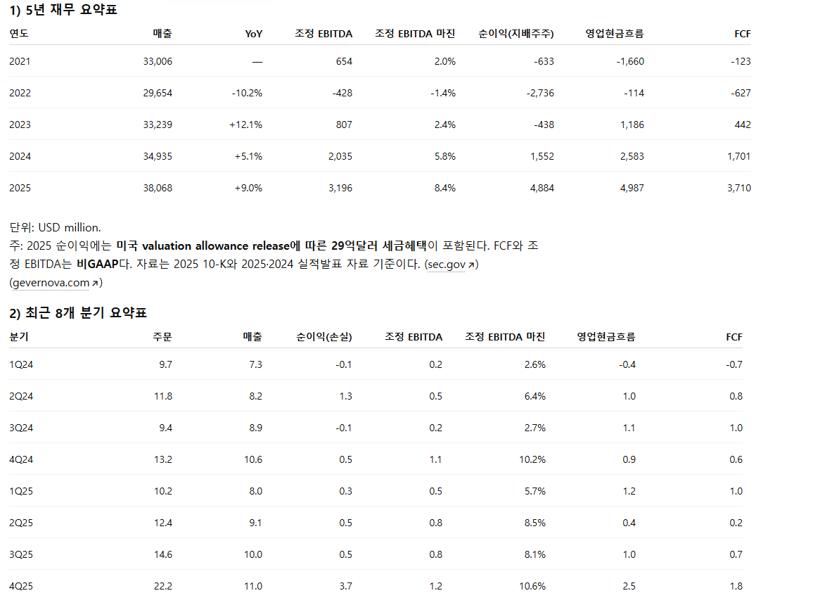 수익성 개선 속도가 빠르다. 조정 EBITDA는 2023년 8.07억달러, 2024년 20.35억달러, 2025년 31.96억달러로 늘었고, 조정 EBITDA 마진은 2.4% → 5.8% → 8.4%로 개선됐다. 2026년 가이던스는 매출 440~450억달러, 조정 EBITDA 마진 11~13%, FCF 50~55억달러다.