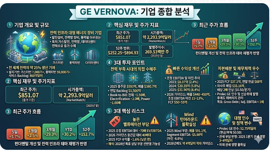 GE Vernova는 발전설비, 전력망 장비, 풍력을 묶은 전력 인프라 순수주에 가까우며, 특히 가스발전 + 전력망 + 데이터센터 전력수요 증가의 직접 수혜를 받는 대형 에너지 장비 회사다. 회사는 자사 기술이 전 세계 전력의 약 25% 생산에 사용된다고 설명하고, 설치기반은 가스터빈 7,000기 이상, 풍력터빈 59,000기 이상, 서비스 backlog는 860억달러라고 제시한다. 이는 회사 주장과 공식 설치기반 수치가 섞여 있다.현재 주가, 시가총액, 52주 고점/저점, 최근 1년 주가 흐름 요약
