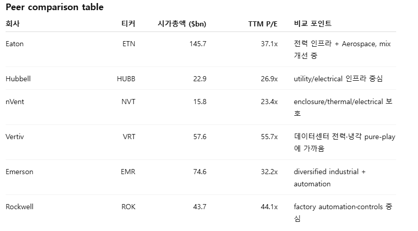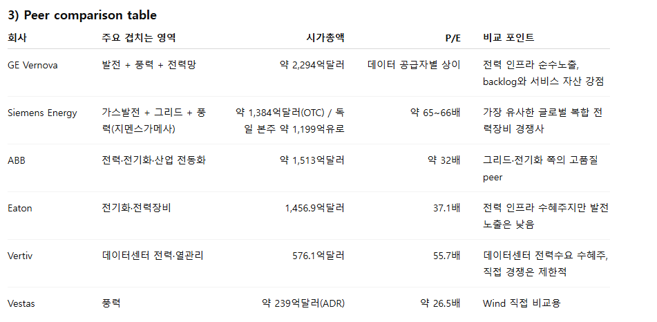 받을 이유는 있다. 이유는 순수 전력 인프라 노출, 가스발전과 전력망 두 축의 동시 성장, 대형 서비스 backlog, 2028년까지의 공격적 margin/FCF 업사이드 때문이다. 하지만 지금 valuation은 이미 산업 평균보다 많이 높다. 그래서 “프리미엄이 정당한가”와 “프리미엄 폭이 과한가”를 나눠 봐야 한다. 내 판단은 프리미엄 자체는 정당, 현재 프리미엄 폭은 빡빡이다.