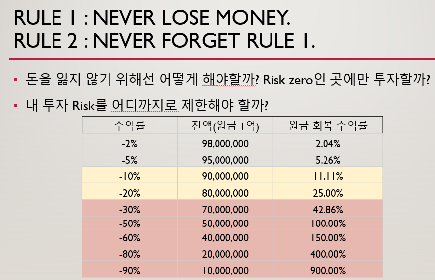 사람들이 많이 좋아하는 워렌 버핏의 명언으로 흔히 인용되는 문구를 가져와서, stop loss의 중요성에 대해 언급한 표입니다.