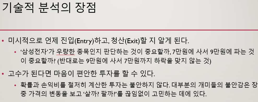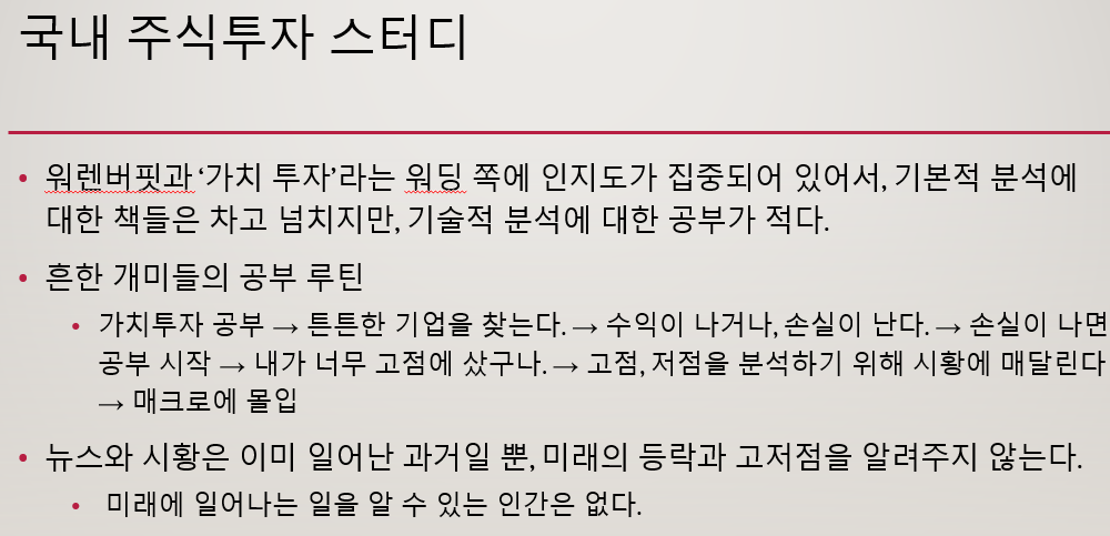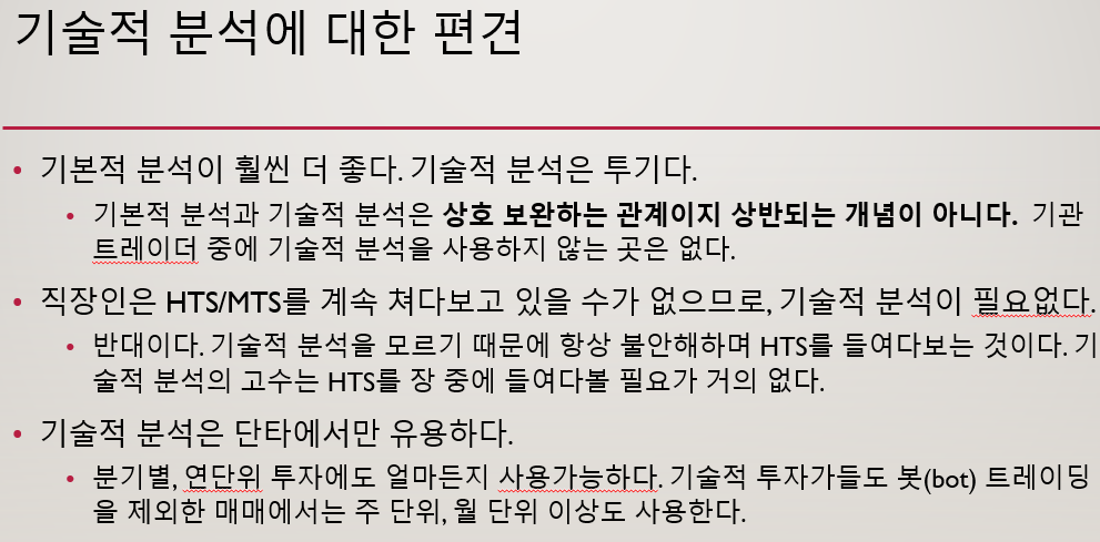 이 PPT를 제작할 때만 해도 '단타', '차트매매' 같은 단어로 기술적 분석들이 상당히 폄하받거나, 가치투자가 최고라는 식의 키워드가 유행하던 때 였습니다. 항상 '밸런스'를 추구하는 저는 기술적 분석에 대한 오해를 풀어서 설명하고 싶었습니다.