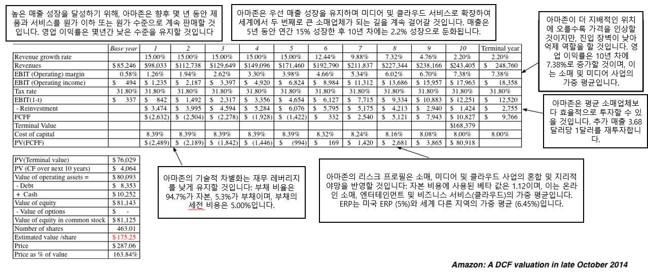 예를 들어 보겠습니다. 아마존은 많은 사람들이 주목하는 회사로, 세계는 아마존을 두고 크게 두 가지 시각으로 나뉩니다. 하나는 아마존이 세계를 정복할 계획을 가진 특별한 회사라고 믿는 사람들이고, 다른 하나는 아마존을 오랜 기간 동안 많은 사람들을 속일 수 있다는 사례로 보는 사람들입니다. 2014년 10월에 작성한 글에서 저는 아마존의 가치를 평가하여 주당 175달러라는 값을 도출했습니다.