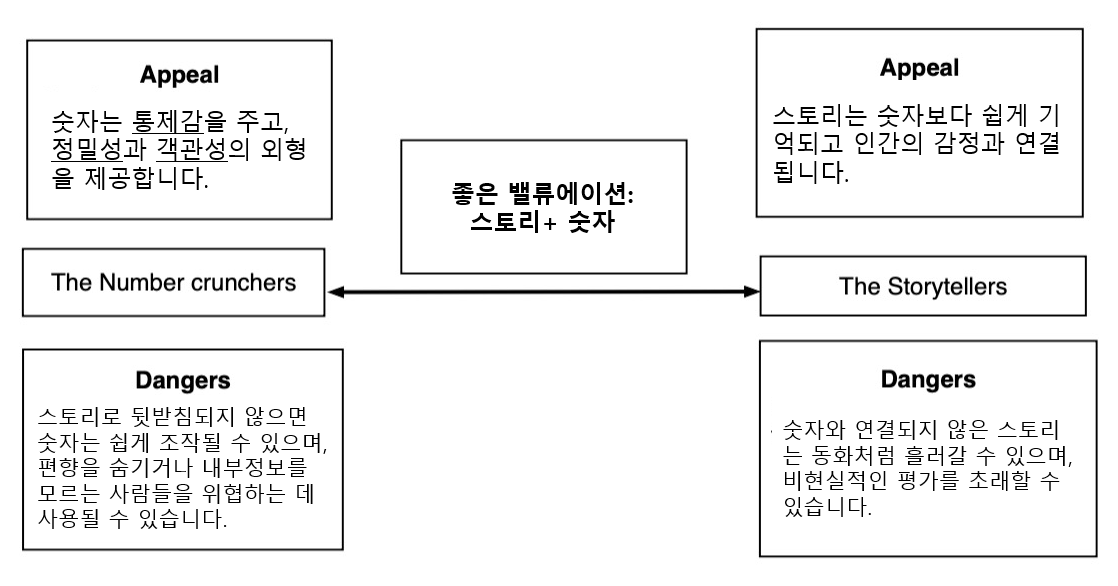 저는 수업을 시작할 때 학생들에게 숫자에 더 익숙한지, 아니면 이야기(스토리)에 더 익숙한지 물어봅니다. 예상대로 숫자에 익숙한 학생들이 훨씬 많지만, 스토리에 익숙한 학생들도 적지 않게 있습니다. (이와 같은 판단을 내리는 온라인 테스트가 여러 개 있지만, 사실 대부분은 테스트 없이도 어느 쪽에 속하는지 감이 있습니다.) 그 다음에 저는 두 그룹을 연결하는 다리로서의 가치평가에 대한 저의 비전을 설명합니다. 가치평가는 스토리와 숫자를 연결하는 방법이라는 점에서 중요한 의미를 갖습니다.