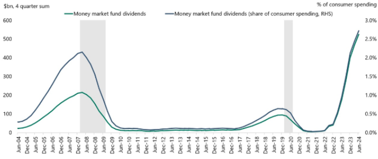 이는, 미국 소비자들이 모든 소비 활동(예: 음식, 주택, 여행 등)에 지출하는 총액에서 2.5%는 MMF 배당금에서 나온 추가 소득으로 충당되고 있다는 의미입니다.