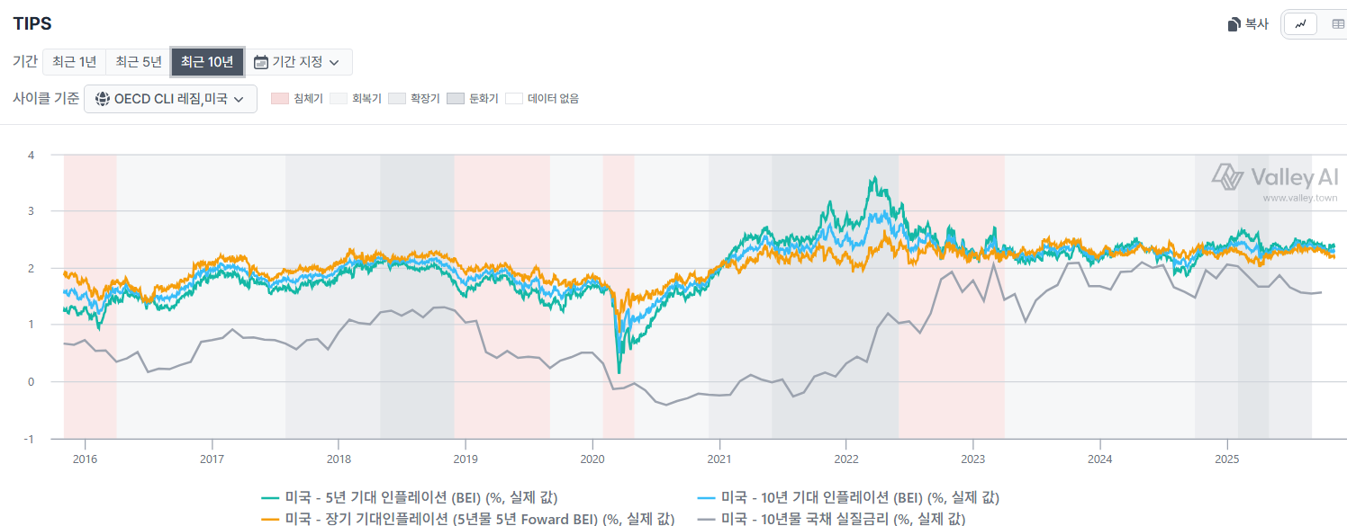 이 녀석은 시장의 기대인플레이션과 실질 금리를 비교하는 부분입니다. 재미있는 점은 5년, 10년으로 놓고 보았을때 TIPS 기준으로는 물가 상승률에 대한 기대치가 2% 정도에서 2.5%로 아주 천천히 구조적으로 이동하고 있다는 점입니다. 저는 이 수준이 거의 3% 정도일 줄 알았는데 제가 시장에 비해 인플레이션 가능성을 높게 잡고 있음을 알 수 있었습니다.
