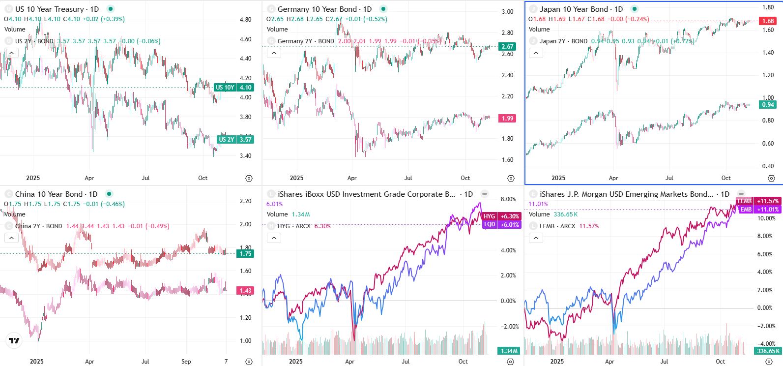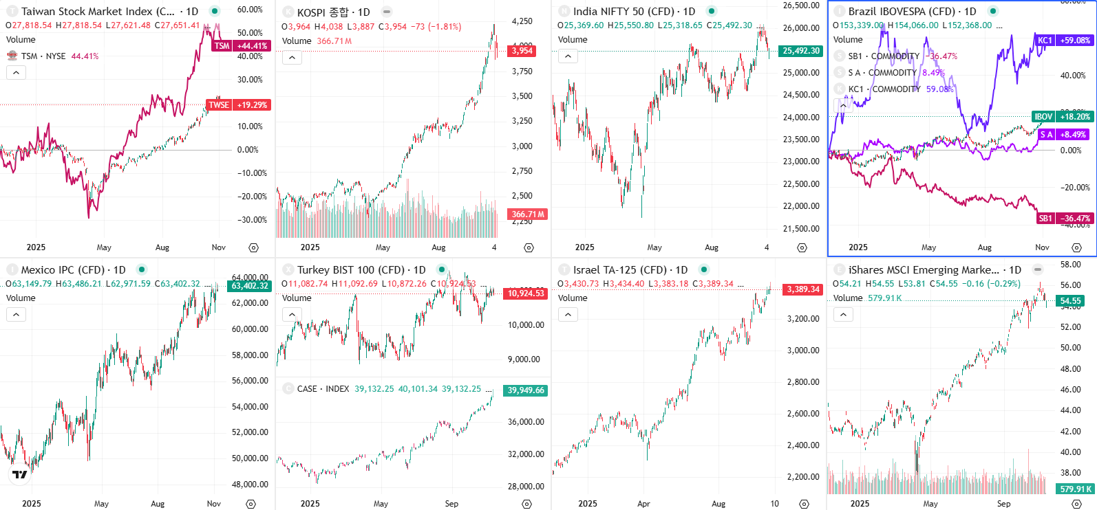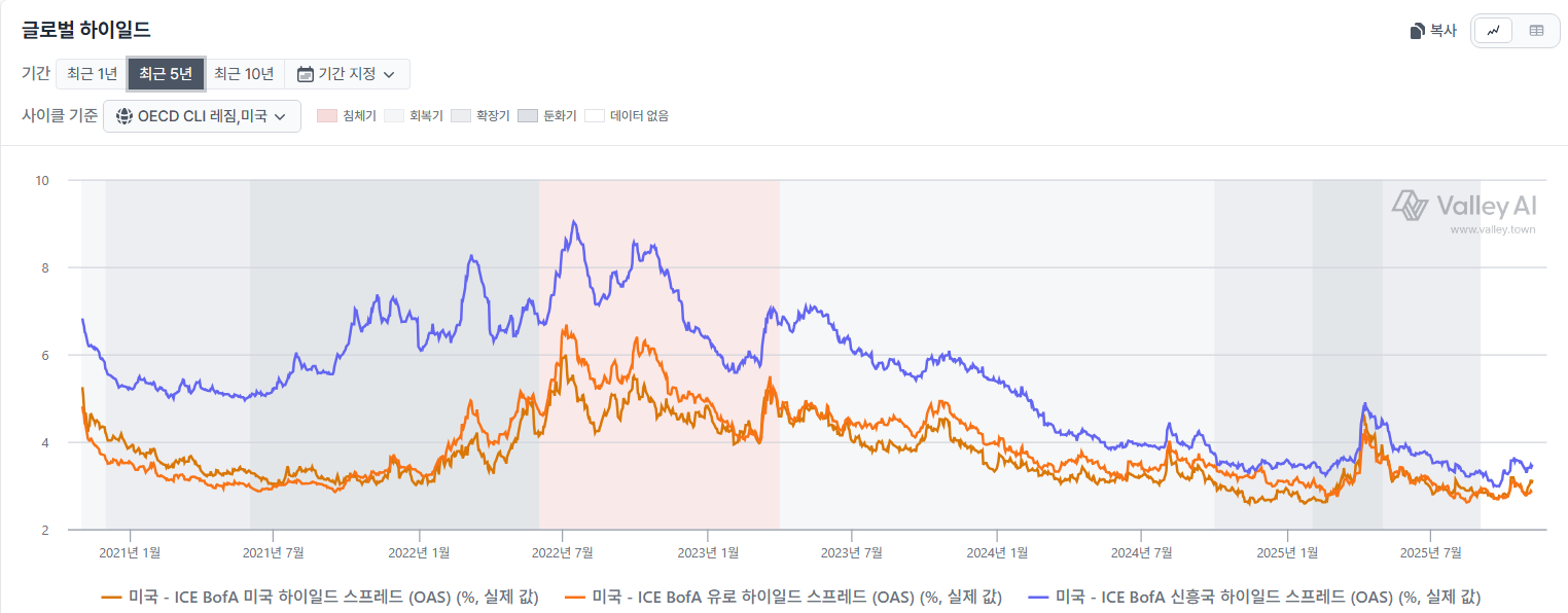 이 녀석은 글로벌 하이일드 스프레드를 세 부분으로 나누어 확인할 수 있도록 구성했습니다. 요즘에는 하이일드 스프레드가 비슷해지고 있고 특히 신흥국의 하이일드 스프레드가 상당히 내려왔다는 것을 확인할 수 있습니다. 약달러와 금리인하의 힘이 주요하겠죠?
