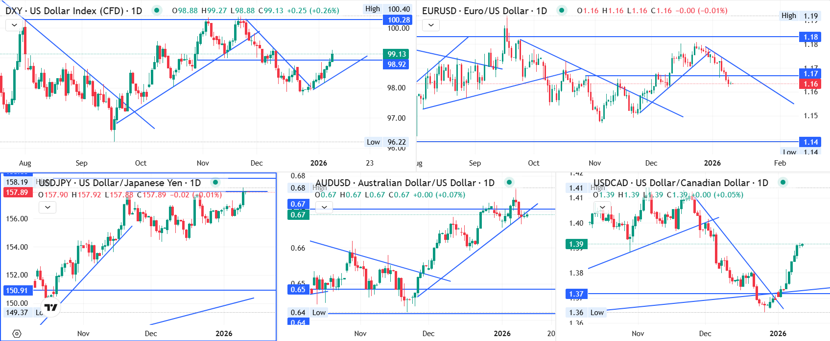 달러 중기 추세는 다른 주요국 통화 대비 강세로 전환되었으며 미국 경기 상승, 물가 보합 또는 하락에 기반한 자산가격 상승에 영향을 받고 있습니다. 다음 주에는 기술적 조정(단기 하락)이 나타날 수 있으므로 다른 통화들을 활용해서 달러 포지션을 위한 예수금을 모아도 좋을 것 같습니다.