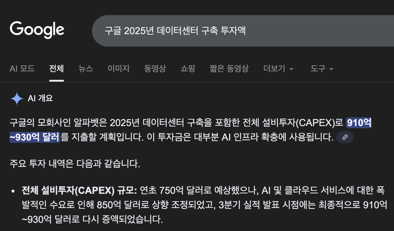기사에 따르면 구글이 25년 데이터 센터 구축에 투자한 금액: 약 900억달러