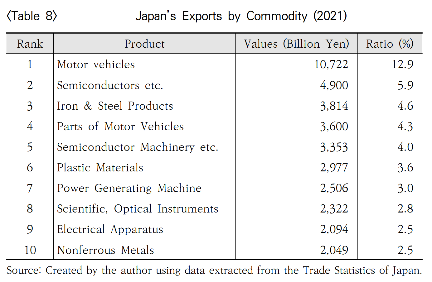 일본은 수출품 다양성이 줄어들고 특정 산업 집중도가 높아짐: 특히 자동차 수출이 1위