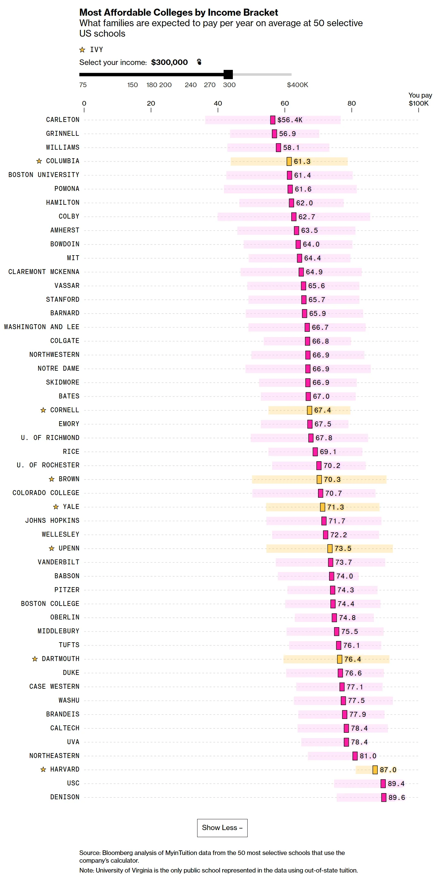 The new aid thresholds, which go into effect for the 2025-26 school year, are no coincidence. A Bloomberg analysis of financial aid data from 50 selective colleges shows that in many cases, middle-class families, defined by some metrics as making between $100,000 and $300,000, earn too much to qualify for meaningful aid but too little to afford college out of pocket.