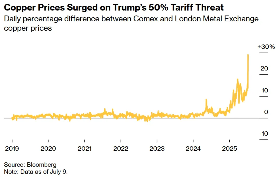 이제 막바지에 다다르고 있습니다. 트럼프가 이번 주 8월 1일부터 구리 수입에 50% 관세를 부과할 것이라고 밝혔기 때문입니다. 이 소식은 미국 내 구리 가격을 다시 급등시켰고, 여전히 미국 국경을 넘어 금속을 들여오려는 트레이더들, 특히 궁극적인 이익이 훨씬 클 것이라는 기대에 엄청난 프리미엄을 지불하고 물량을 확보했던 이들에게는 위기감이 고조되었습니다. 만약 그들이 관세를 피할 수 있다면 말이죠.