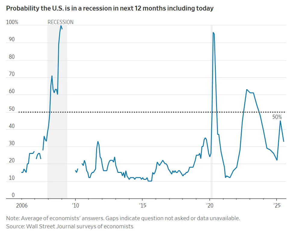 On average they put the probability of recession in the next 12 months at 33%, down from 45% in April, but higher than January’s 22%.