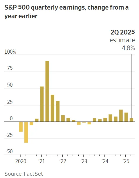 Analysts expect profits from companies in the S&P 500 to climb 4.8% in the second quarter, according to FactSet. That would mark the lowest year-over-year growth since 2023, and a steep drop from the 13% jump during the first three months of this year.