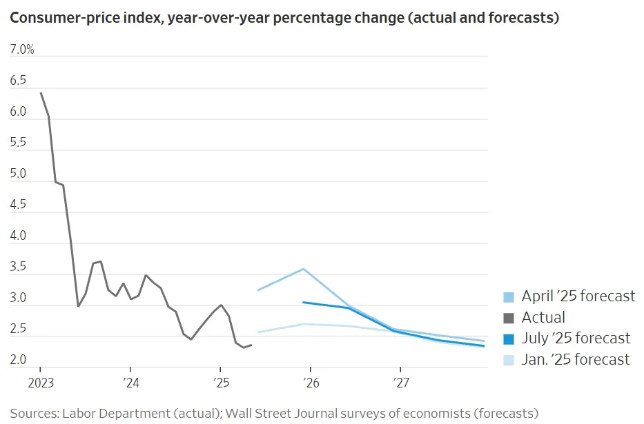 6월 연준 회의록에 따르면, 일부 연준 관계자들은 기업들이 관세가 발효되기 전에 비축해 둔 재고를 소진할 때까지는 가격을 인상하지 않을 것이라고 추정하고 있습니다. 월스트리트저널 설문조사에 참여한 경제학자들은 트럼프의 관세 계획이 2025년 4분기 소비자 물가 지수(CPI)로 측정되는 인플레이션에 0.7%포인트를 추가할 것으로 예상하고 있습니다.