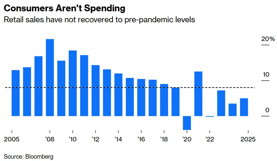 셋째, 수요 측면을 해결하는 것은 어떨까요? 전자상거래 대기업들이 벌이는 영역 다툼은 분명 소비자 지출의 약화 때문입니다. 올해 소매 판매 성장률은 5%에 머물고 있는데, 이는 팬데믹 이전의 8%에 훨씬 못 미치는 수준입니다.
