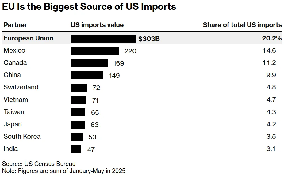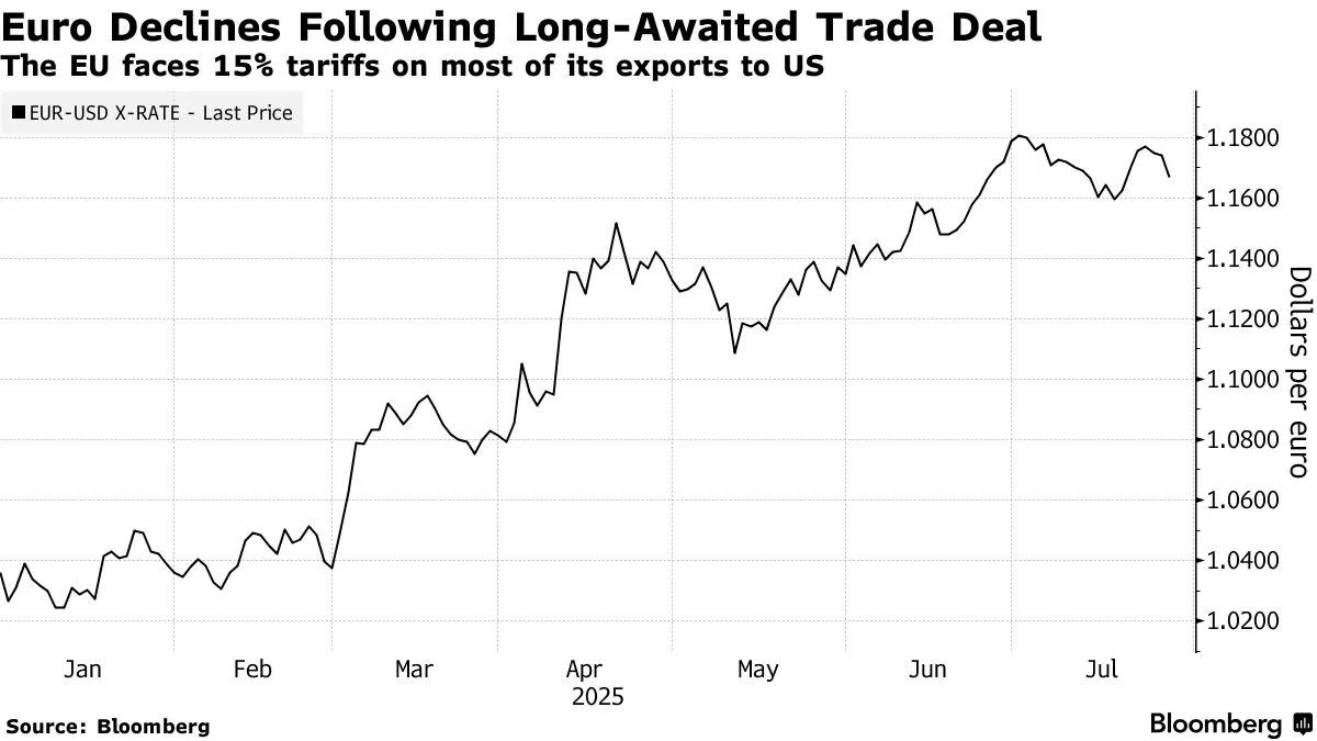 주말 동안 EU는 대부분의 수출품에 15% 관세를 수용하기로 합의했으며, 합의 발효 시 미국 제품에 대한 EU의 평균 관세율은 1% 미만으로 떨어질 것입니다. 브뤼셀은 또한 7,500억 달러 상당의 미국 에너지 제품을 구매하고 미국에 6,000억 달러를 추가 투자할 것이라고 밝혔습니다.