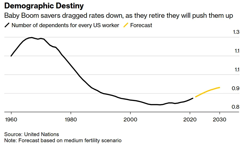 베이비붐 세대의 은퇴, 중국과 산유국의 저축 과잉 종료, 정부 차입 증가로 인해 자연 이자율의 화살표는 하락에서 상승으로 바뀌었습니다. 블룸버그 이코노믹스 계산에 따르면, 자연 이자율은 2012년 최저치인 1.7%에서 2024년 현재 약 2.5%까지 올랐습니다. 인구 통계, 부채 등 기타 요인들의 그럴듯한 궤적을 바탕으로 볼 때, 2030년에는 2.8%까지 상승하여 10년 만기 국채 금리가 4.5%에서 5% 사이에 머무르게 될 것입니다.