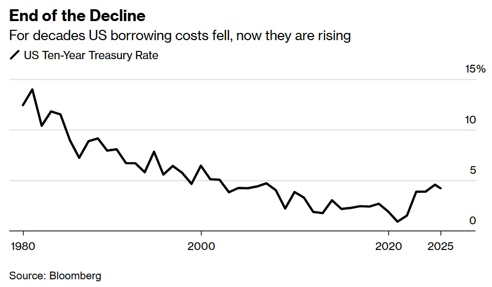 그럼에도 불구하고 중요한 변화가 일어났습니다. 30년 넘게 미국과 전 세계의 차입 비용은 하락했습니다. 하지만 이제는 상승하고 있습니다. 미국 재무부부터 월스트리트의 헤지펀드 거물, 401(k) 투자자에 이르기까지 모두에게 이것은 힘든 전환기입니다. 트럼프가 파월을 해고한다고 해도 이 흐름은 바뀌지 않을 것입니다.