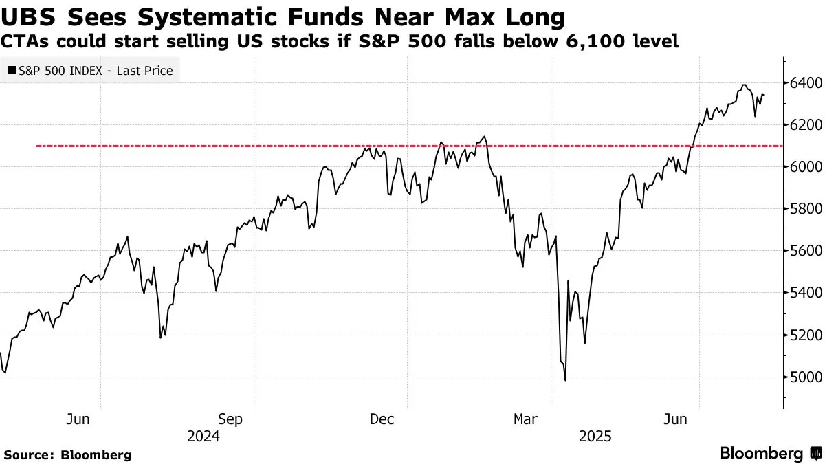 CTAs, who have been persistent stock buyers, are long $50 billion of US stocks, putting them in the 92nd percentile of historical exposure, according to Goldman Sachs Group Inc. However, the S&P 500 would need to breach 6,100, a decline of roughly 4.5% from where the index closed on Friday, for CTAs to begin dumping stocks, said Maxwell Grinacoff, head of equity derivatives research at UBS Group AG.