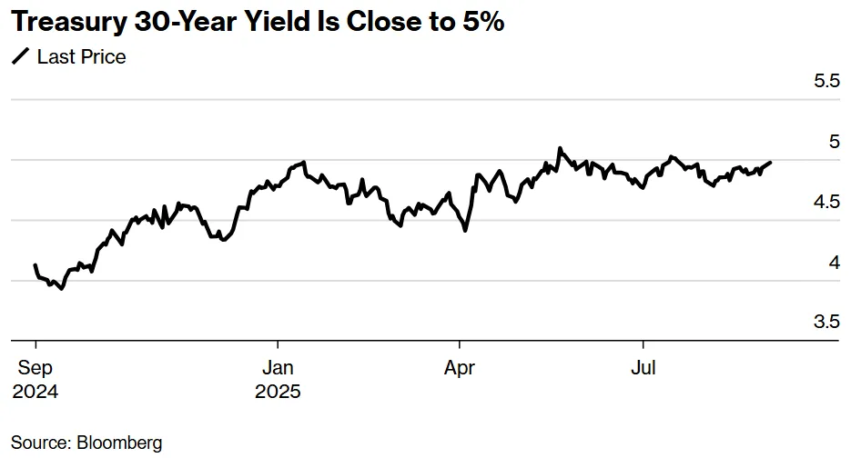US 30-year yields approached 5%, pressuring tech shares whose valuations have widened during a surge from April lows. While the S&P 500 trimmed its losses, almost 400 of its shares fell. All megacaps slipped, with Nvidia Corp. seeing its longest slump since March. In late hours, Alphabet Inc. jumped as a federal judge ruled Google doesn’t have to sell its Chrome web browser.