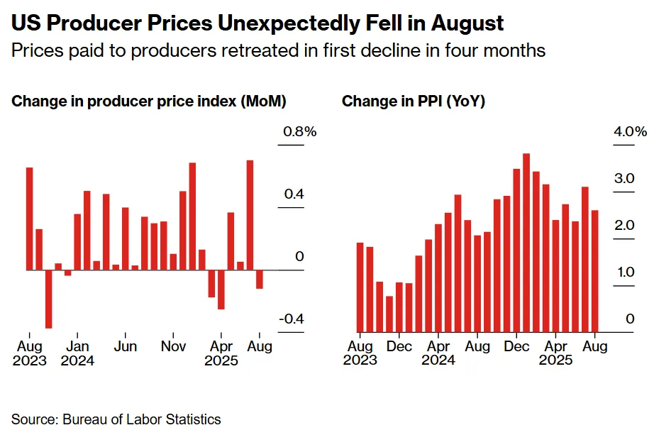 Just a week ahead of the Fed decision, the first drop in producer prices in four months soothed worries that elevated inflation would create a challenge for policymakers trying prevent a jobs downturn. The market reaction was immediate, and traders almost fully priced in three rate reductions in 2025.
