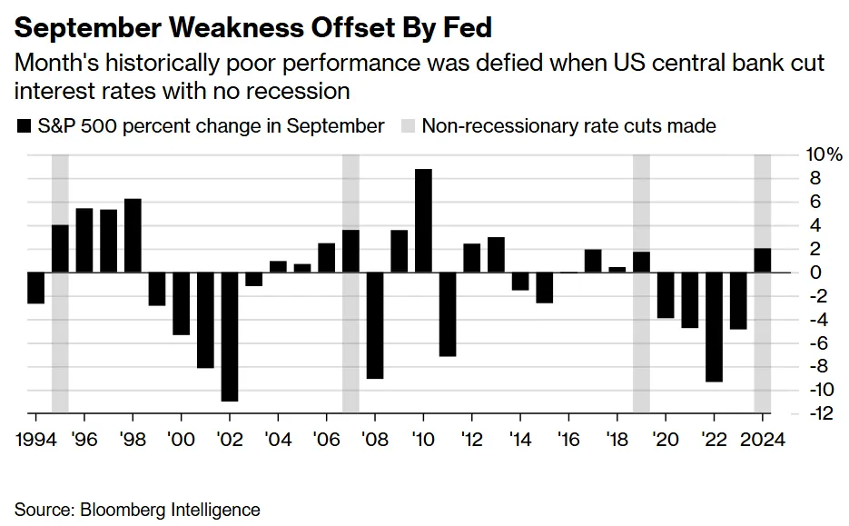 Easier policy is a big source of support for stock bulls at a time when sky-high valuations are confronting bearish seasonality. Over the last 75 years, the S&P 500 has posted an average decline of 0.7% in September, according to LPL Financial. The gauge is up over 2.5% this month.