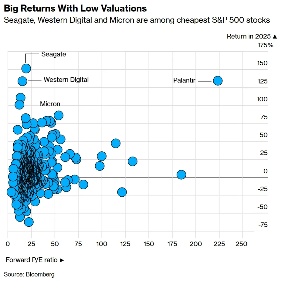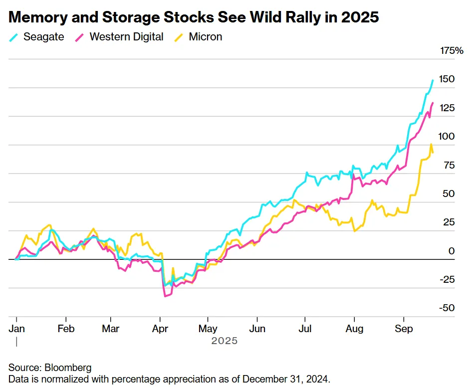 Seagate Technology Holdings Plc, which makes hard disk drives for computers, is the best performing stock in the S&P 500 Index this year after soaring 156%. Rival Western Digital Corp. ranks third with a 137% gain. And Micron Technology Inc., the biggest maker of memory chips in the US, is fifth following a record 12-session winning streak pushed its 2025 rise to 93%.