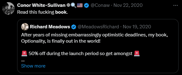 지난 토요일(2월 8일) 시냅스 미팅에서 유연님 질문에 대한 대답으로 《Optioinality》라는 책을 알게 된 경위에 대해 잠깐 얘기했었습니다. 주말동안 조금 더 생각나는 것들을 정리해서 기록으로 남겨둡니다. (아마 2019년 말 즈음부터) 정리해야 할 지식의 양이 폭발하는 걸 느낍니다. 동시에 글쓰기 능력에 대한 관심이 자라나기 시작했습니다. 꽤 오래 전부터 알고 있었던 David Allen의 GTD 방식을 확장한 Tiago Forte의 P.A.R.A. 라는 방법론이 눈에 들어옵니다. Tiago Forte의 블로그 글들을 팔로우 하다가 zettelkasten이라는 방법론에 대한 글을 보게됩니다: ...