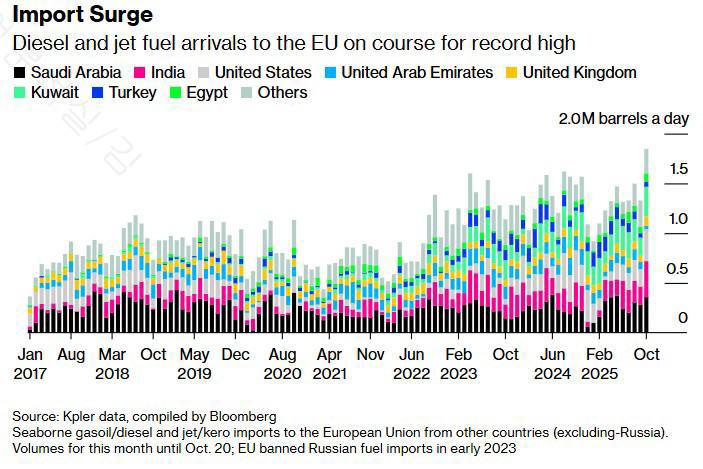 유럽의 디젤 및 항공유 수입이 급증하였다. 이는 '23년 EU의 러시아산 석유제품 수입 금지 후 월간 기준 사상 최대치로 증가