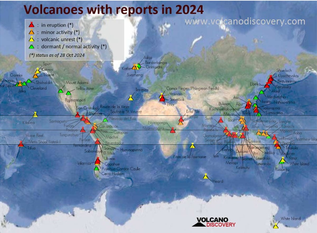 2024년 화산 분출 예보가 있었던 지역이다. 이 중에는 화산 예보는 있었느나 실제로는 분출하지 않은 곳도 있고 해저나 소규모 분출은 보고에서 생략되어 있을 수 있다. 색 표시는 2024년 10월 28일을 기준한 화산의 현재 상태를 나타낸다.