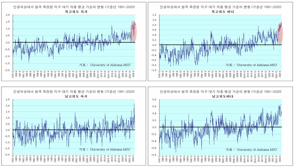 아래의 자료는 북고위도(북위 20도-90도)지역과 남고위도 (남위 20도 -90도) 지역의 육지와 바다 기온 변동이다. 1991년-2020년의 30년 평균 기온을 기준으로 할 때 이 기준대비 차이(anormali)를 그린 것이다.