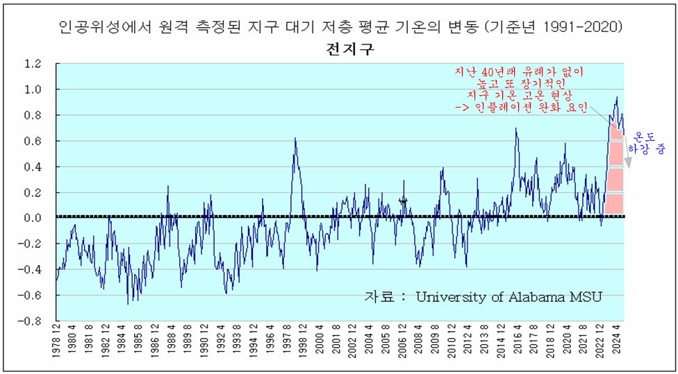 둘째는, 에너지 수요와 곡물 생산에 영향을 매우 큰 미치는 지구의 온도가 2022 후반부터 전례 없는 수준으로 높게 오른 후 고온이 유지되고 있다. 특히, 북위 20도에서 90도(북극)까지의 북반구 고위도 지역의 육지와 바다의 온도가 매우 높게 유지되고 있어, 인구 밀도와 경제 밀도가 가장 높은 이 지역의 에너지 수요를 줄이고 곡물 생산을 늘려 인플레이션 완화에 기여해 왔다.