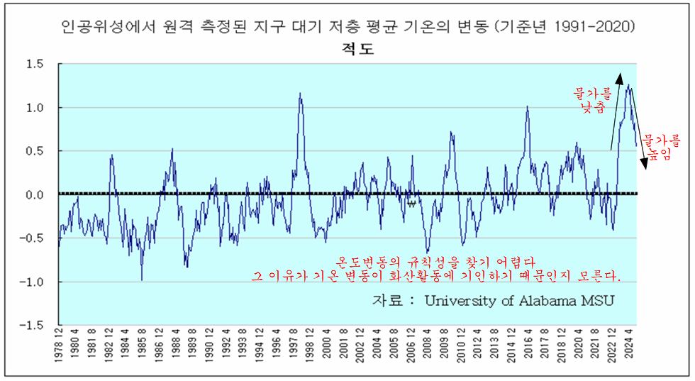 그림에서 보면 남위 20도에서 북위 20도까지의 적도지역에 화산 활동이 집중되어 있다. 아마도 이 지역의 화산활동이 라니냐와 엘니뇨에 큰 영향을 미치는 듯 하다. 라니냐와 엘니뇨의 불규칙성은 화산활동의 불규칙성을 반영하는지 모른다.