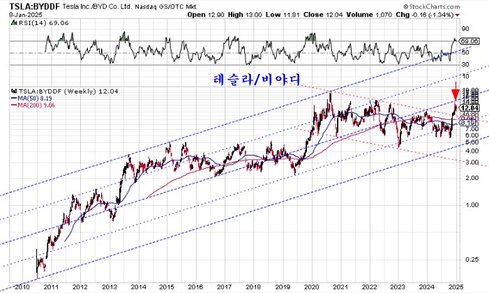다음은, 테슬라 주가를 중국 비야디 주가로 나눈 상대비율이다. 상대비율의 구조분석 차트에서 보면 중요한 저항권으로 지금은 테슬라를 비야디로 바꾸어 보유할 때이다.