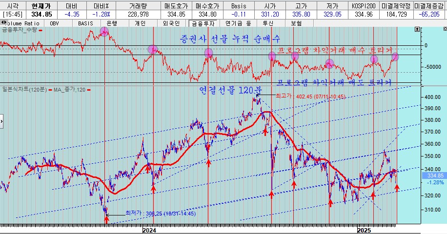 그래서 증권의 선물 매수가 한계에 이르면 프로그램 차익거래 매도가 충분히 이뤄져 바스켓이 비게 되고, 이후 프로그램 차익거래 매수가 쉬운 환경이 된다. 이런 조건이 될 때 외국인은 선물을 매수하여 프로그램 매수거래를 유인하고, 프로그램 매수와 함께 주가가 오른다.
