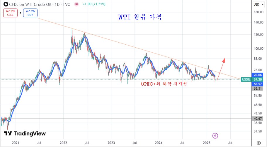 트럼프 취임 이후 하락이 이어졌던 원유 가격이 OPec+의 하락 저지선인 배럴당 65$을 터치한 후 상승 반전되고 있다.