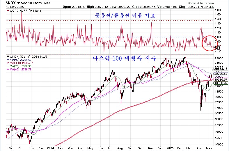 트럼프의 관세 전쟁 후 나타났던 급락 변동이 의례 그런 것처럼 자연스럽게 원위치로 되었으나, 파생상품 시장에서 콜옵션 투기 강세와 함께 주가가 반등이 과도하게 진행되어 있다.
