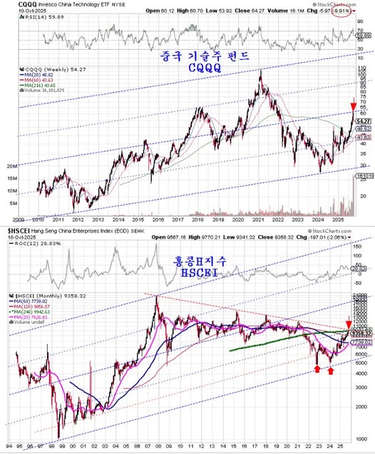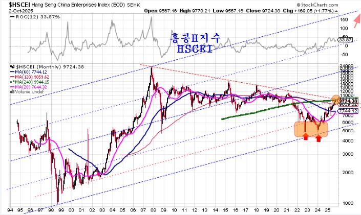 2022년 하반기부터 2024년 초까지 홍콩h지수가 저평가이고 대세 채널의 바닥이라며 매수를 권했지만 당시 무척 욕을 먹었던 기억이 있다. 그러나 지금은 그 때 예상하던 모습 그대로 대세 상승이 이어지면서 그 때 일시적 손실을 감내하며 저가에서 매수한 사람들은 꾸준한 수익이 이어지고 있다.