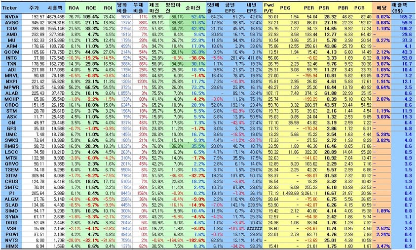 다음은 미국 반도체 섹터 기업 중 시가총액 40위까지 실적지표와 밸류에이션 지표를 나타낸다. 반도체지수의 상승은 엔비디아와 대만반도체 TSM의 인공지능 수요 증가에 따른 높은 수익성과 성장을 반영하는 상승을 해 왔지만 나머지 대다수 기업들은 실적이 저조한 가운데 밸류에이션이 고평가 상태이다.