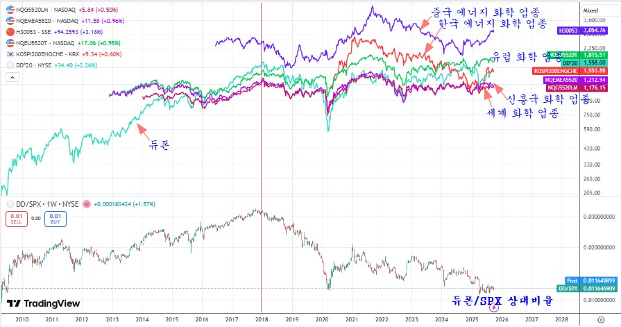 다음은 화학 기업을 대표하는 듀폰과 전세계 화학업종지수 그리고 듀폰의 주가를 미국 인덱스 SPX로 나눈 상대비율 차트이다.