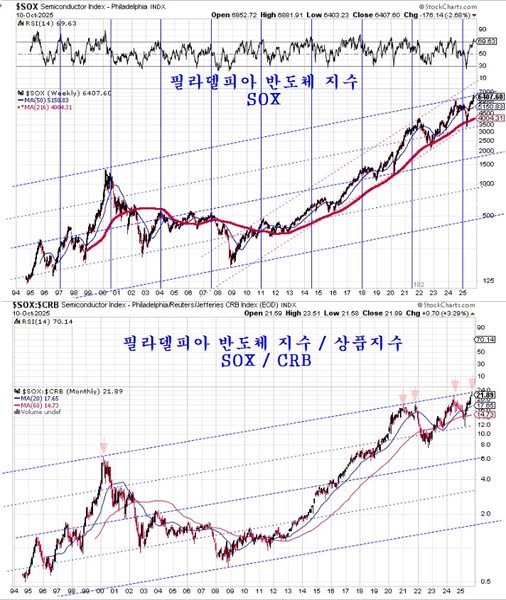 필라델피아 반도체 지수 SOX 와 필라델피아 반도체 지수를 #상품지수 #CRB 나눈 상대비율 차트이다. 중요한 전환점에 위치한다.
