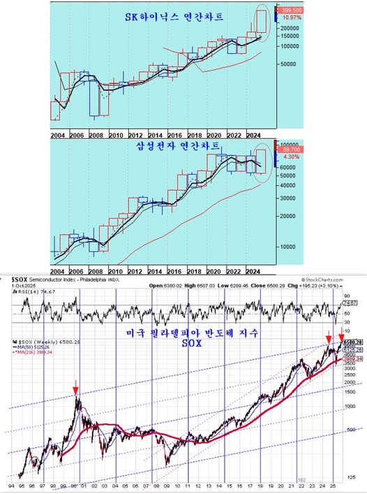 미국 필라델피아 $반도체지수 가 대세채널의 천정권에 진입하여 장기 추세 하락 전환을 앞둔 가운데, #sk하이닉스 와 #삼성전자 가 외국인의 대량 매수에 힙입어 급등하고 있다.