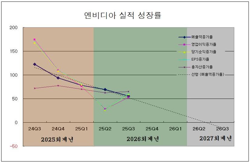 성장률 추세선 추이의 결과 향후 4분기 이내에 매출액 성장률이 0 이하로 둔화될 가능성과 과도한 설비투자 내지 사업확장의 결과 칩의 독점공급에 따른 높은 마진율이 낮아질 수 있다는 점에서 주가의 추가 상승 여력이 제한되며 인공지능의 성장률 둔화와 함께 반도체 지수은 대세 천정을 만들게 될 듯 하다.